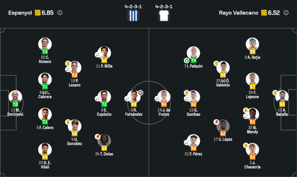 แม้ราโย่จะแพ้ แต่รางวัล Man of the Match จาก Sofascore ตกเป็นของ อิซี ปาลาซอน ปีกขวาพันธุ์ดุที่ได้คะแนนสูงถึง 7.4 เขาคือคนที่สร้างความปั่นป่วนให้แนวรับเอสปันญ่อลมากที่สุด ทั้งเลี้ยงกินตัว เปิดบอลอันตราย และดึงจังหวะให้เพื่อนสอดขึ้นมาเล่น ถึงจะไม่มีประตูหรือแอสซิสต์ แต่การพาบอลเข้าพื้นที่สุดท้ายหลายครั้งทำให้เขาโดดเด่นกว่าทุกคนในสนามอย่างชัดเจน