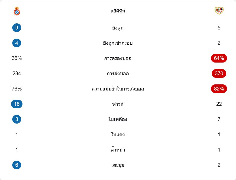 เกมนี้ราโย่ถือบอลมากกว่าชัดเจน ครองบอลถึง 64% ส่งบอล 370 ครั้ง ความแม่นยำสูงถึง 82% ขณะที่เอสปันญ่อลครองบอลเพียง 36% ส่งบอล 234 ครั้ง ความแม่นยำ 76% แต่เจ้าบ้านกลับยิงทั้งหมด 9 ครั้ง เข้ากรอบ 4 ส่วนทีมเยือนยิง 5 เข้ากรอบ 2 ตัวเลขบอกชัดว่าเอสปันญ่อลใช้ทุกโอกาสได้คุ้มกว่า