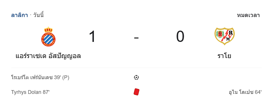 บ้านกีฬา พาเกาะทุกจังหวะในสไตล์คอบอลสายลุย ลาลีกา เกมนี้ที่คอร์เนญา–เอล ปรัตต์ เอสปันญ่อลเปิดบ้านเฉือนราโย่ บาเยกาโน่ 1-0 จากจุดโทษของ โรเบร์โต เฟร์นานเดซ นาที 39 แม้รูปเกมเจ้าถิ่นจะเสียเปรียบการครองบอล แถมโดนใบแดงช่วงท้าย แต่ก็ฮึดปิดประตูเก็บสามแต้มสำคัญต่อหน้าแฟนบอลแบบลุ้นเหนื่อยสุดทาง สมศักดิ์ศรีคนตามเช็กสกอร์แบบ ผลบอลสด