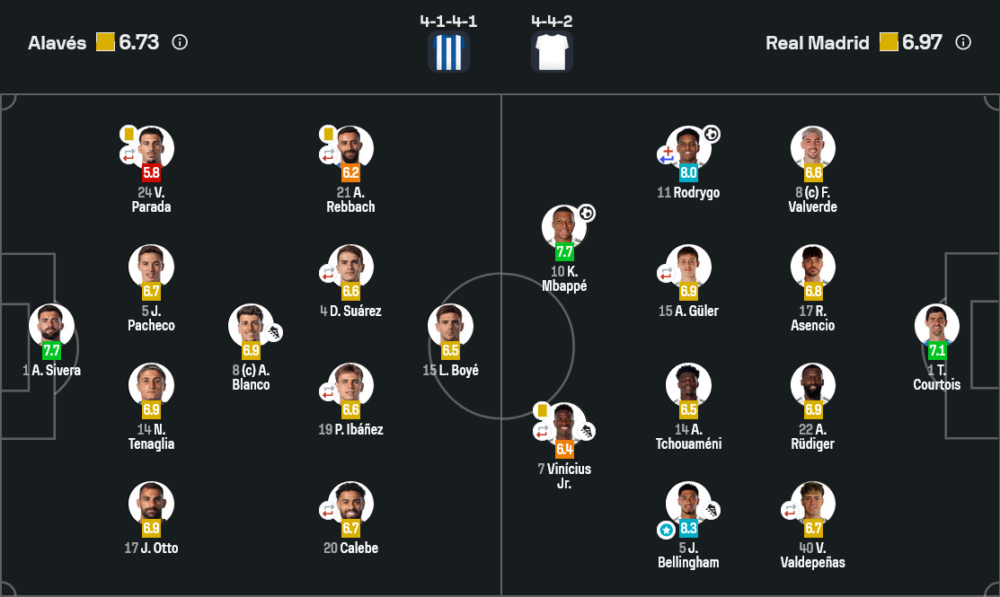 ด้านเรอัล มาดริด ของ ชาบี อลอนโซ่ ใช้ 4-4-2 ที่ยืดหยุ่น เวลาโจมตีจริง เบลลิงแฮมจะดันขึ้นไปเป็นจอมทัพ สามประสาน เอ็มบัปเป้–วินิซิอุส–โรดรีโก้ สลับตำแหน่งกันตลอด ทำให้แนวรับอลาเบสอ่านทางยาก เมื่อถูกกดดันหนัก รือดิเกอร์ และชูอาเมนี่ใช้การดันไลน์สูงเพื่อบีบให้เจ้าบ้านเล่นบอลยาว ซึ่งเข้าทางลูกโหม่งของกองหลังชุดขาว