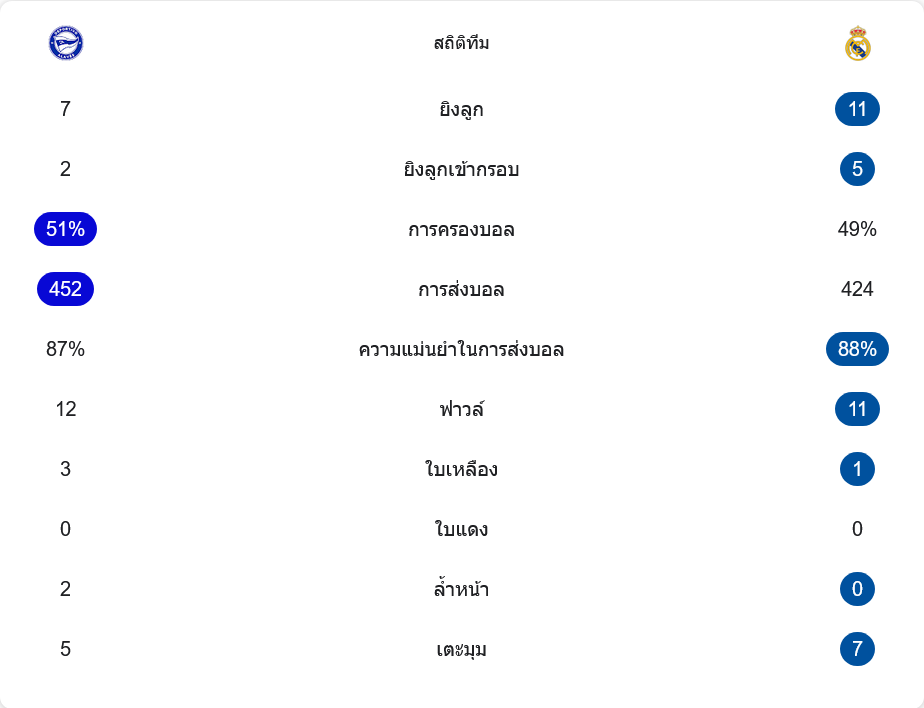 ตัวเลขหลังเกมสะท้อนภาพรวมได้ดี อลาเบสไม่ได้เป็นรองมาก หลายช่วงยังครองบอลมากกว่าด้วยซ้ำ ทีมเจ้าบ้านมีโอกาสยิงทั้งหมด 7 ครั้ง เข้ากรอบ 2 ครั้ง ส่วนเรอัล มาดริดสร้างโอกาสได้ 11 ครั้ง เข้ากรอบถึง 5 ครั้ง แสดงให้เห็นว่าทีมเยือนลงโทษความผิดพลาดของคู่แข่งได้ดีกว่า