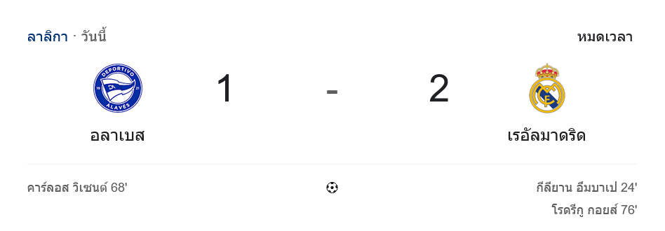 ศึก ลาลีกา ที่เมนดิซอร์โรซา เกมนี้แฟนเช็คสกอร์ผ่าน ผลบอลสด กันแบบลุ้นตัวโก่ง เมื่ออลาเบสเปิดบ้านรับการมาเยือนของยักษ์ใหญ่ เรอัล มาดริด และจบลงด้วยชัยชนะของทีมเยือน 2-1 จากประตูของ คีลิยัน เอ็มบัปเป้ และ โรดรีโก้ ส่วนเจ้าถิ่นได้ คาร์ลอส บีเซนเต้ ยิงตีเสมอชั่วคราว ทำให้บรรยากาศในสนามเดือดตั้งแต่นาทีแรกจนสิ้นเสียงนกหวีดสุดท้าย โดย “บ้านกีฬา” ขอสรุปแบบจัดเต็มสไตล์ บ้านผลบอล