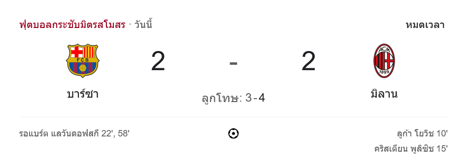 การแข่งขันฟุตบอลกระชับมิตรสโมสร 2024 ระหว่างทีม บาร์เซโลน่า กับ เอซี มิลาน จบลงด้วยผลเสมอ 2-2 ในเกมที่เต็มไปด้วยความตื่นเต้นและการเล่นที่น่าประทับใจจากทั้งสองทีม