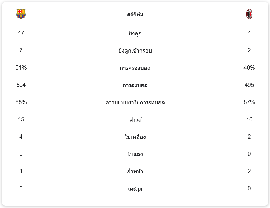 สรุปผลและผลกระทบต่อทีม ด้วยผลเสมอในนัดนี้ บาร์เซโลน่า และ เอซี มิลาน ยังต้องพยายามปรับปรุงฟอร์มการเล่นของพวกเขาต่อไปในเกมถัดไป การแข่งขันนัดนี้แสดงให้เห็นถึงความสามารถและความมุ่งมั่นของทั้งสองทีมในการทำประตูและคว้าชัยชนะในอนาคต