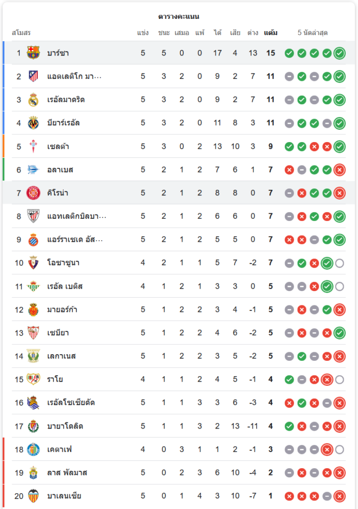 ตารางคะแนนบอลวันนี้ ลาลิกา 2024 ระหว่าง คิโรน่า 1-4 บาร์เซโลน่า วันนี้ 16/9/67