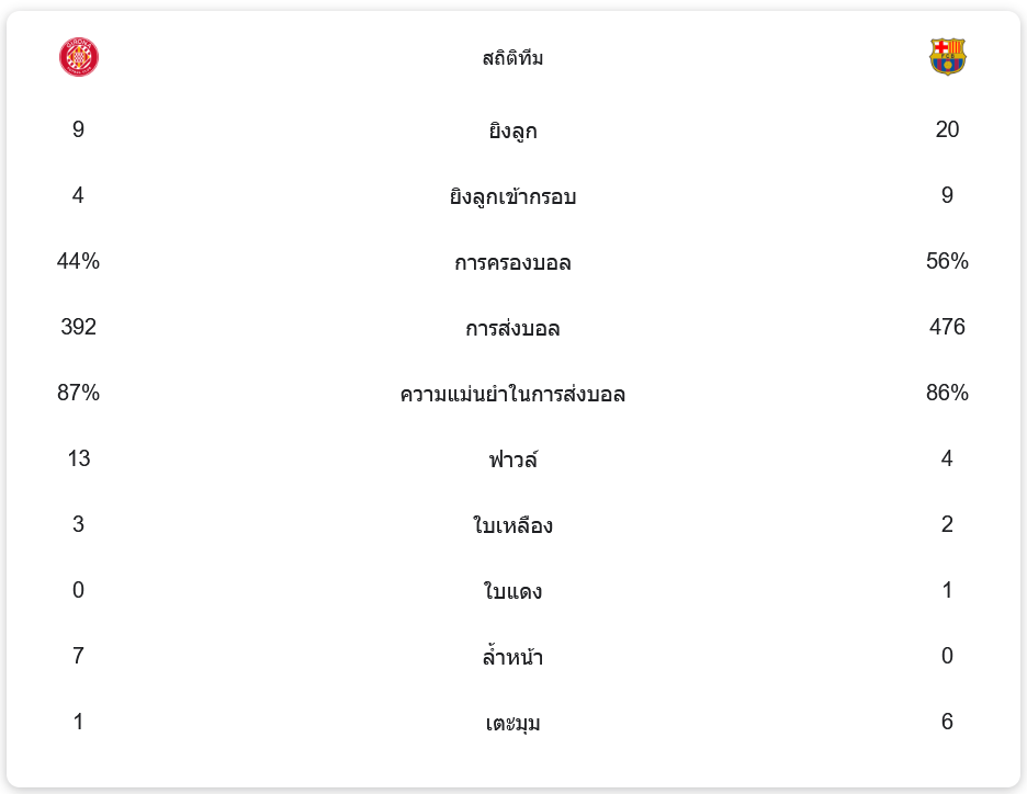 สถิติทีมบอลวันนี้ ลาลิกา 2024 ระหว่าง คิโรน่า 1-4 บาร์เซโลน่า วันนี้ 16/9/67