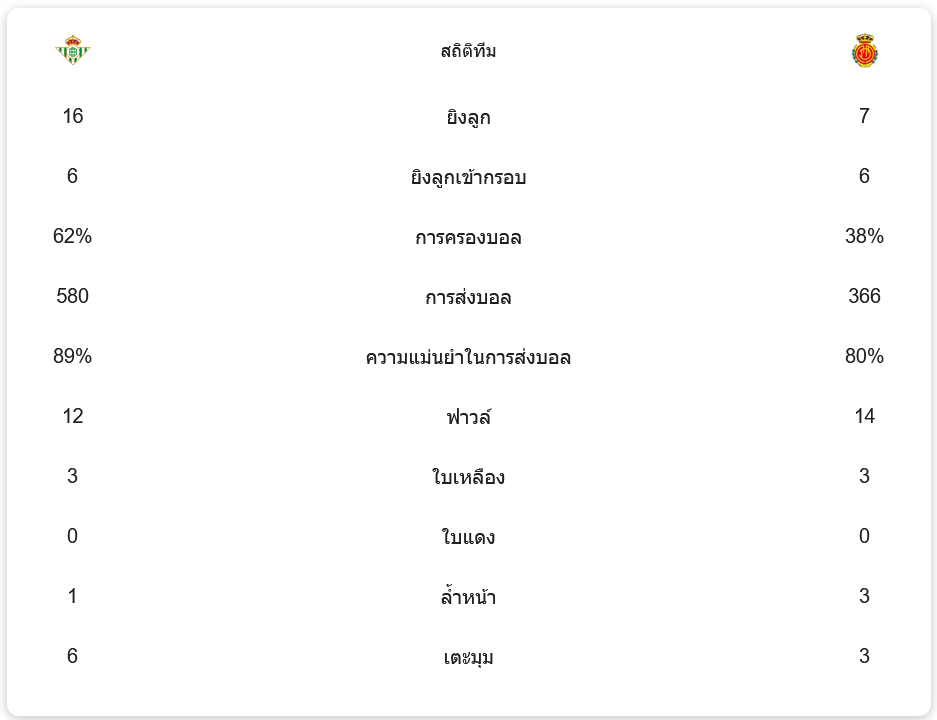 ในเกมนี้ เรอัล เบติสมีการครองบอลมากถึง 62% และมีโอกาสยิงถึง 16 ครั้ง แต่เปลี่ยนเป็นประตูได้เพียงลูกเดียว ขณะที่มายอร์ก้าแม้จะครองบอลได้น้อยกว่าเพียง 38% แต่สามารถทำประตูได้ถึง 2 ประตู จากโอกาสยิงเพียง 7 ครั้ง แสดงให้เห็นถึงความเฉียบคมในการจบสกอร์