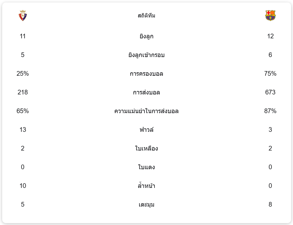 ในแมตช์นี้ บาร์เซโลน่า ครองบอลได้ถึง 75% มีการส่งบอลทั้งหมด 673 ครั้ง ด้วยความแม่นยำถึง 87% ขณะที่ โอซาซูน่า ครองบอลเพียง 25% ส่งบอลเพียง 218 ครั้ง แต่โอซาซูน่ากลับใช้โอกาสทำประตูได้อย่างคุ้มค่า ยิงทั้งหมด 11 ครั้ง และเข้ากรอบถึง 5 ลูก แม้ว่าบาร์ซ่าจะมีโอกาสยิงถึง 12 ครั้ง และเข้ากรอบ 6 ลูก แต่ไม่สามารถเจาะแนวรับของโอซาซูน่าได้มากพอ