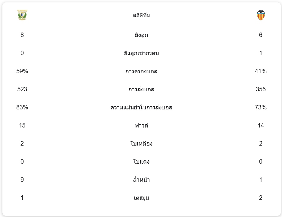 การแข่งขันในนัดนี้ เลกาเนส ครองบอลได้มากกว่าที่ 59% ขณะที่ บาเลนเซีย ครองบอลได้ 41% ทั้งสองทีมมีจำนวนการส่งบอลที่แตกต่างกันอย่างชัดเจน โดยเลกาเนสส่งบอลได้ถึง 523 ครั้ง ส่วนบาเลนเซียส่งบอลได้เพียง 355 ครั้ง ความแม่นยำในการส่งบอลของเลกาเนสอยู่ที่ 83% ซึ่งเหนือกว่าบาเลนเซียที่มีเพียง 73% การฟาวล์เกิดขึ้นบ่อยครั้งในเกมนี้ เลกาเนสทำฟาวล์ไป 15 ครั้ง ขณะที่บาเลนเซียทำฟาวล์ไป 14 ครั้ง ทั้งสองทีมได้รับใบเหลืองทีมละ 2 ใบ แต่ไม่มีใบแดงเกิดขึ้น