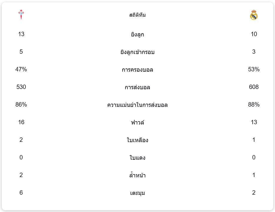 สถิติลาลิกา 2024 ระหว่าง เซลต้า บีโก้ 1-2 เรอัล มาดริด