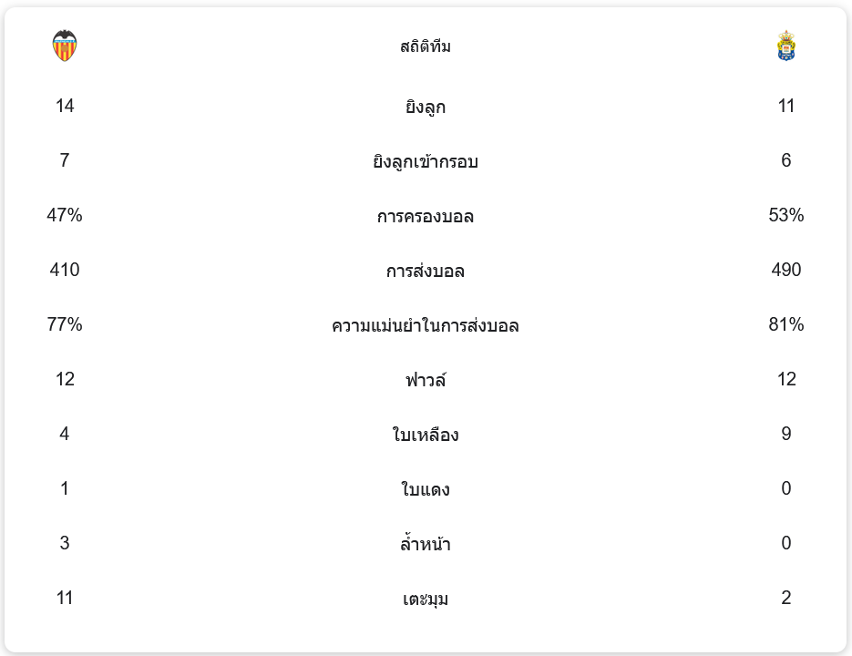จากการแข่งขันในนัดนี้ บาเลนเซีย ยิงทั้งหมด 14 ครั้ง โดยยิงเข้ากรอบได้ 7 ครั้ง ขณะที่ ลาส พัลมาส ยิงไป 11 ครั้ง ยิงเข้ากรอบ 6 ครั้ง แม้การครองบอลของบาเลนเซียจะอยู่ที่ 47% ส่วนลาส พัลมาสครองบอลได้ 53% และการส่งบอลของลาส พัลมาสทำได้แม่นยำกว่าด้วย 81% ของความแม่นยำในการส่งบอล ในขณะที่บาเลนเซียส่งบอลแม่นยำอยู่ที่ 77% แต่ที่ทำให้เกมนี้ดุเดือดคือจำนวนใบเหลืองที่เกิดขึ้นถึง 13 ใบ และใบแดงของบาเลนเซีย