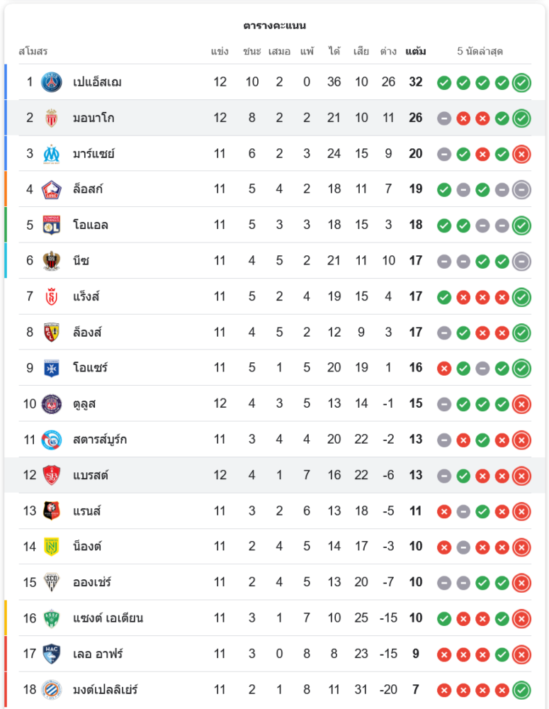 โมนาโกยังคงรั้งอันดับ 2 ของตารางลีกเอิงด้วย 26 คะแนนจาก 12 นัด ขณะที่แบรสต์ยังคงอยู่ในโซนล่าง มี 13 คะแนนจาก 12 นัด ต้องเร่งเก็บแต้มเพื่อหลีกเลี่ยงการตกชั้น