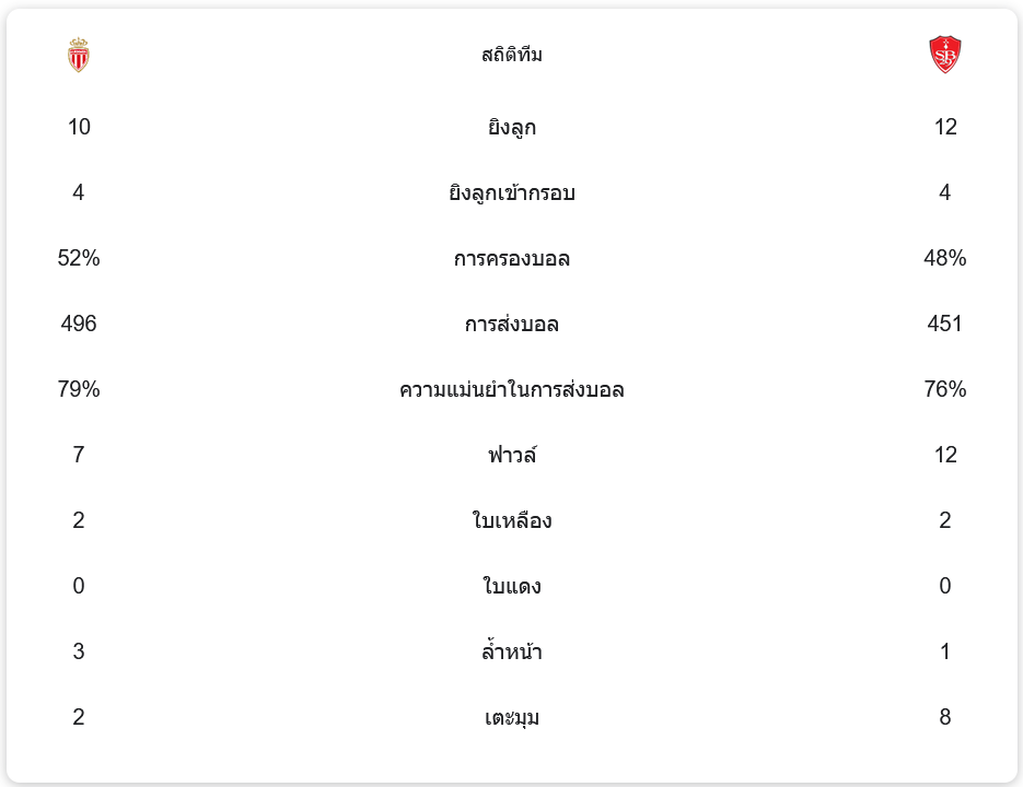 โมนาโกครองบอล 52% และผ่านบอลสำเร็จ 496 ครั้ง ด้วยความแม่นยำ 79% มีโอกาสยิง 10 ครั้ง เข้ากรอบ 4 ครั้ง ในขณะที่แบรสต์ครองบอลเพียง 48% ผ่านบอลสำเร็จ 451 ครั้ง ด้วยความแม่นยำ 76% แต่พวกเขาสร้างโอกาสยิงได้ 12 ครั้ง และเข้ากรอบ 4 ครั้งเช่นกัน