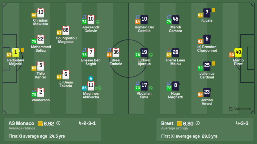 เริ่มเกมได้เพียง 5 นาที โมนาโกขึ้นนำเร็วจาก แม็กเนส อัคลิอุช ที่โชว์ความเฉียบขาดยิงประตูแรกจากการแอสซิสต์ของ เอเลียส เบน เซฆีร์ ทำให้ทีมเจ้าบ้านเล่นด้วยความมั่นใจต่อเนื่อง นาทีที่ 24 อเล็กซานเดอร์ โกโลวิน บวกประตูที่สองจากการประสานงานเกมรุกที่ยอดเยี่ยมของทีม จบครึ่งแรก โมนาโกนำห่าง 2-0 โดยแบรสต์พยายามโต้กลับแต่ยังไม่สามารถทะลวงแนวรับของเจ้าบ้านได้