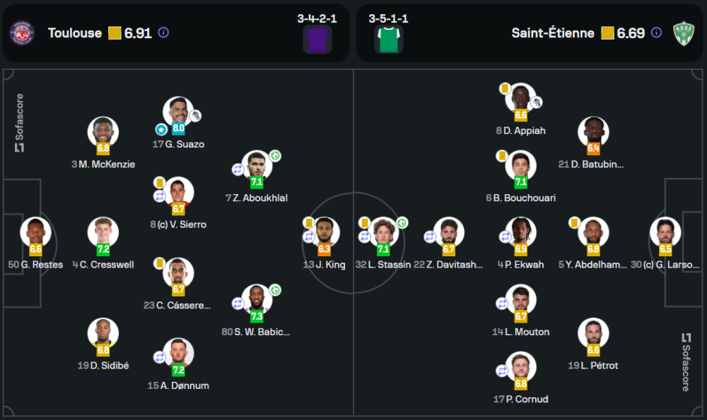 กาเบรียล ซัวโซ่ ของตูลูส ได้คะแนนสูงสุด 8.0 จากผลงานการแอสซิสต์และการเล่นเกมรับที่ยอดเยี่ยม