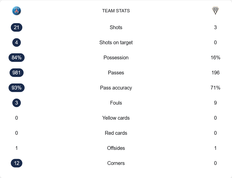 เปแอสเชเหนือกว่าทุกด้าน ครองบอลถึง 84% ผ่านบอลเกือบ 1,000 ครั้ง ความแม่นยำสูงถึง 93% มีโอกาสยิงทั้งหมด 21 ครั้ง ตรงกรอบ 4 ครั้ง ได้ลูกเตะมุมถึง 12 ครั้ง ขณะที่อองเช่ร์มีโอกาสยิงเพียง 3 ครั้ง และไม่มีลูกยิงตรงกรอบเลย สะท้อนความแตกต่างชัดเจนระหว่างสองทีม