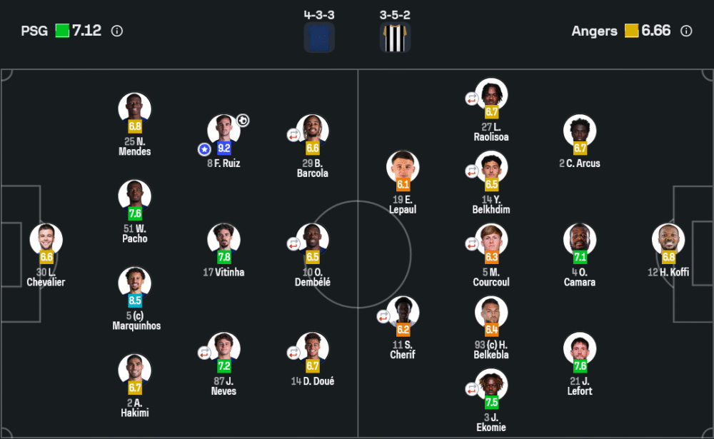 รูปแบบการเล่น 4-3-3 ของเปแอสเชทำให้ทีมสามารถคุมแดนกลางได้อย่างเบ็ดเสร็จ การเคลื่อนที่ของ ฟาเบียน รุยซ์ และ วิตินญ่า ช่วยต่อบอลได้ลื่นไหลและสร้างโอกาสบ่อยครั้ง แต่ปัญหาคือการเข้าทำจังหวะสุดท้ายที่ยังไม่เฉียบคมพอ ด้านอองเช่ร์ในระบบ 3-5-2 เน้นเกมรับเป็นหลัก ถอยลึกกันทั้งทีมและใช้โอกาสสวนกลับแต่ไม่สามารถจบสกอร์ได้ จากมุมมอง วิเคราะห์บอล เกมนี้คือการปะทะกันระหว่างการครองเกมอย่างเหนือชั้นของเปแอสเชกับการตั้งรับแน่นหนาของอองเช่ร์