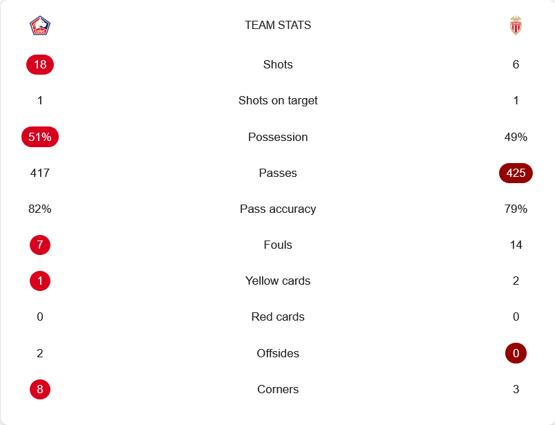 ตลอด 90 นาที ลีลล์ครองบอล 51% ต่อ 49% ของโมนาโก แม้ตัวเลขใกล้เคียงกัน แต่โอกาสยิงประตูต่างกันชัดเจน เจ้าถิ่นมีโอกาสยิง 18 ครั้ง เข้ากรอบ 1 ส่วนโมนาโกยิงเพียง 6 ครั้ง เข้ากรอบ 1 ครั้ง เกมรับของทั้งสองทีมเหนียวแน่น แต่ลีลล์มีความมุ่งมั่นและความคมในจังหวะสุดท้ายมากกว่า นอกจากนี้เกมยังเดือดด้วยการฟาวล์รวม 21 ครั้ง ใบเหลืองออกไปถึง 3 ใบ (ลีลล์ 1, โมนาโก 2) สะท้อนความเข้มข้นและความกดดันของเกม