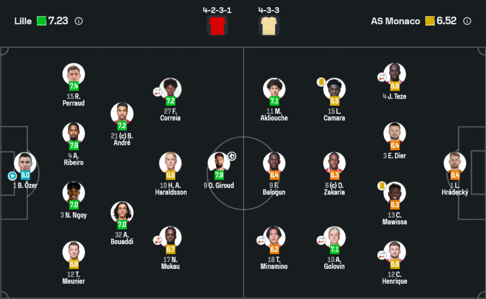 เบอร์เก้ ออเซอร์ (Lille) ผู้รักษาประตูวัยหนุ่มโชว์ฟอร์มสุดยอด เซฟสำคัญหลายครั้งจนทำให้ทีมเก็บคลีนชีตได้สำเร็จ คะแนนสูงสุด 8.0 และถือเป็นกำแพงเหล็กของเกมนี้ ส่วนฮีโร่ในสายตาแฟนบอลแน่นอนคือ ชิรูด์ ที่ยิงประตูชัยในช่วงทดเจ็บ