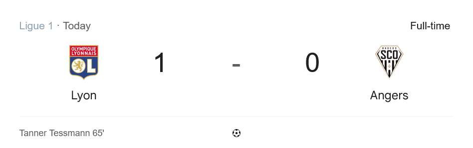 เข้าสู่ครึ่งหลัง ลียงยิ่งเร่งเกมหนัก นาที 65 ความพยายามเป็นผลเมื่อ แทนเนอร์ เทสส์มันน์ กดด้วยความมั่นใจ ส่งบอลพุ่งเสียบตาข่ายเป็นประตูขึ้นนำ 1-0 สร้างเสียงเฮสนั่นสนาม หลังจากนั้น ลียงยังคงบุกต่อ ขณะที่อองเช่ร์พยายามแก้เกมส่ง ฮิมัด อับเดลลี่ และ ซีดิก เชริฟ ลงมาเสริม แต่ก็ไม่สามารถเจาะแนวรับเจ้าบ้านได้ จบเกม ลียงคว้า 3 แต้มล้ำค่าไปครอง