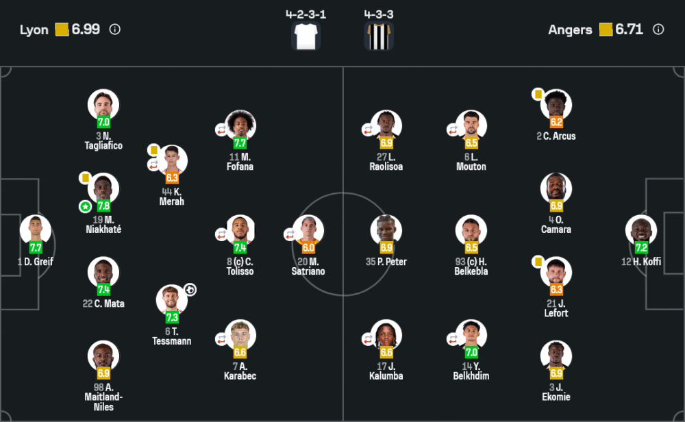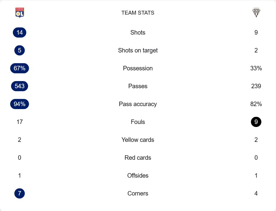 แม้ลียงจะยิงได้เพียงประตูเดียว แต่ตัวเลขชี้ชัดถึงความเหนือกว่า ครองบอลถึง 67% ผ่านบอล 543 ครั้ง ความแม่นยำสูงถึง 94% สร้างโอกาสยิง 14 ครั้ง เข้ากรอบ 5 ครั้ง ขณะที่อองเช่ร์ครองบอลเพียง 33% ยิง 9 ครั้ง เข้ากรอบ 2 ครั้ง แม้จะมีโอกาสสวนกลับแต่ไม่คมพอ การป้องกันของพวกเขายืนหยัดได้ดีจนถึงนาที 65 ก่อนจะโดนทีเด็ด