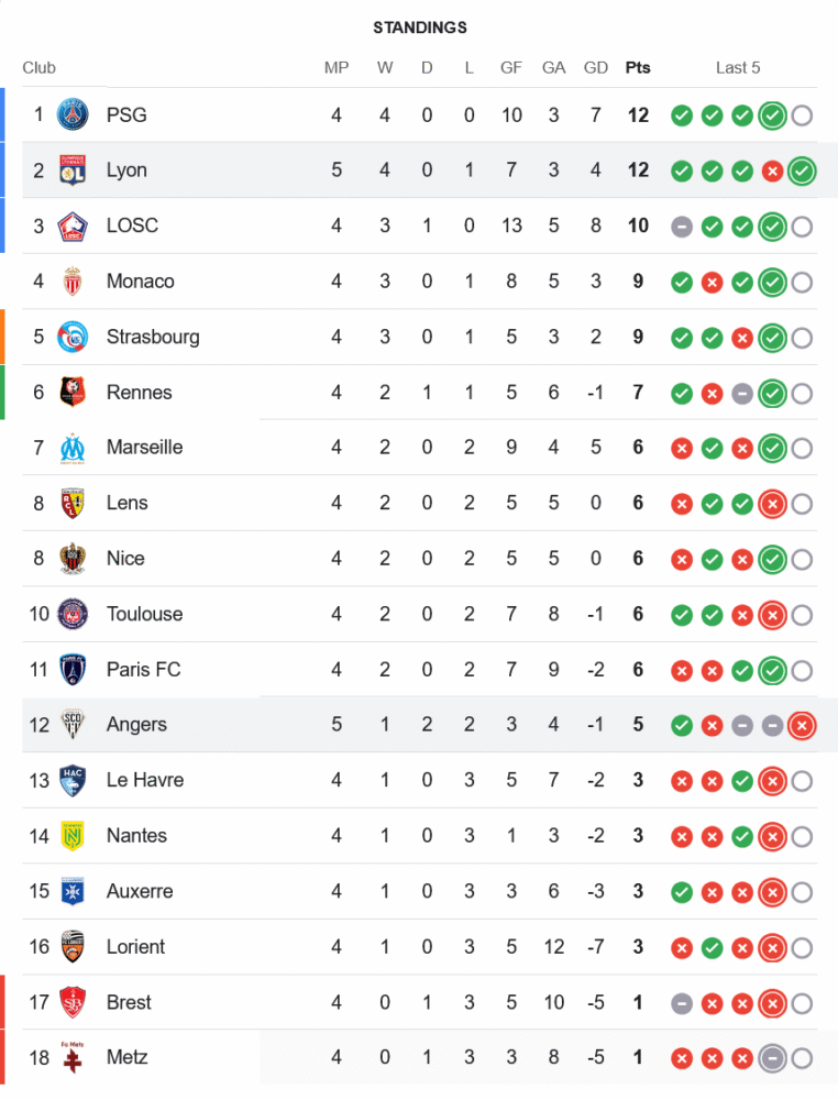 ชัยชนะครั้งนี้ทำให้ ลียง เก็บเพิ่มเป็น 12 คะแนนจาก 5 นัด ขึ้นไปรั้งอันดับ 2 ของตาราง ไล่จี้เปแอสเชที่ยังรักษาสถิติชนะรวด ส่วน อองเช่ร์ แพ้เป็นเกมที่ 2 ของซีซั่น มี 5 คะแนนจาก 5 นัด รั้งอันดับ 12 สถานการณ์เริ่มน่าเป็นห่วงหากไม่เร่งฟอร์มในเกมต่อไป