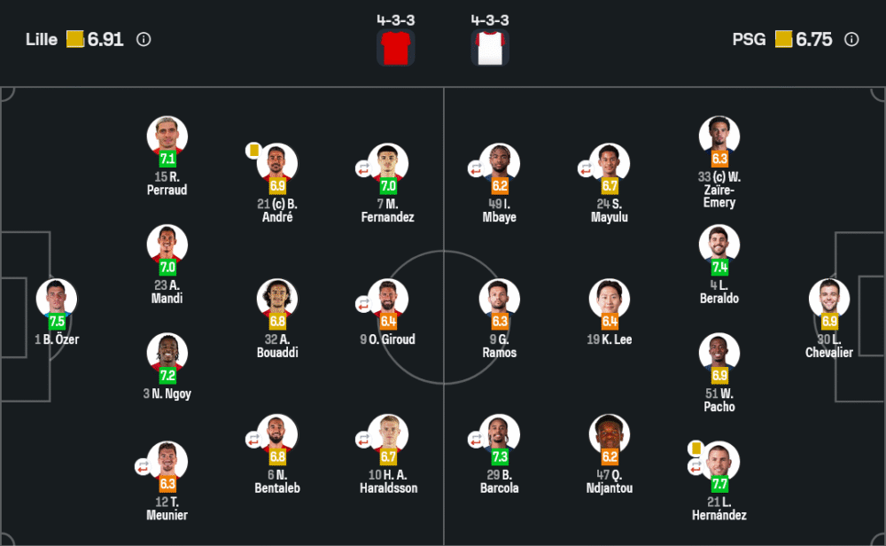 • ลีลล์: ฮามซา อิกามาเน ลงแทน ชิรูด์ (76’), เอธาน เอ็มบัปเป้ ลงแทน เฟอร์นันเดซ (81’)