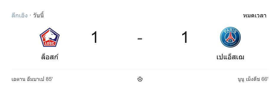 ศึก ลีกเอิง ฝรั่งเศส ค่ำคืนที่ผ่านมา เกมที่แฟนบอลทั่วโลกจับตาอย่าง ลีลล์ เปิดบ้านรับการมาเยือนของ ปารีส แซงต์ แชร์กแมง จบลงด้วยผล เสมอ 1-1 อย่างดราม่า โดย บ้านผลบอล รายงานว่า เปแอสเชต้องรอจนถึงนาที 85 จากฝีเท้าของ คีเลียน เอ็มบัปเป้ ก่อนแบ่งแต้มสำคัญกลับปารีสได้แบบเฉียดฉิว ผลนี้ทำให้ตารางคะแนนขยับเพียงเล็กน้อย แต่ยังรักษาตำแหน่ง จ่าฝูงลีกเอิง ได้สำเร็จ