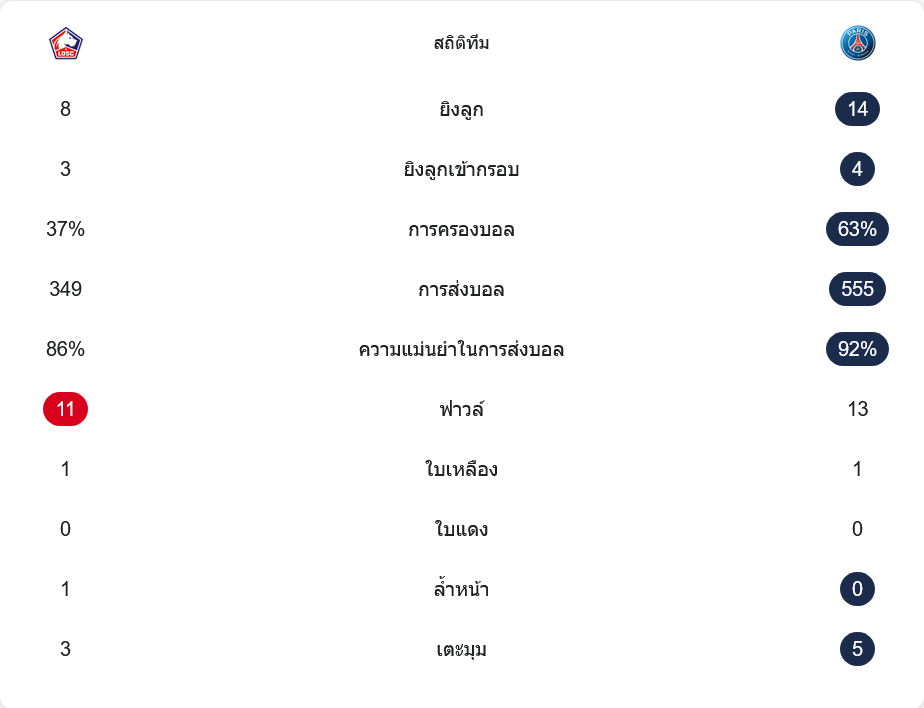 แม้ เปแอสเช จะเหนือกว่าชัดเจนในหลายด้าน ทั้งการครองบอล 63%, การส่งบอลแม่นยำถึง 92% และยิงทั้งหมด 14 ครั้ง แต่ลีลล์ใช้โอกาสที่มีอย่างมีประสิทธิภาพ โดยเฉพาะการยิงเข้ากรอบ 3 ครั้งจากโอกาส 8 ครั้ง แสดงให้เห็นถึงความคมในจังหวะสุดท้าย การเล่นที่แน่นและระเบียบของแนวรับเจ้าบ้านคือจุดแข็ง ขณะที่เกมของเปแอสเชแม้จะครองบอลมากแต่ยังขาดความเด็ดขาดในพื้นที่สุดท้าย