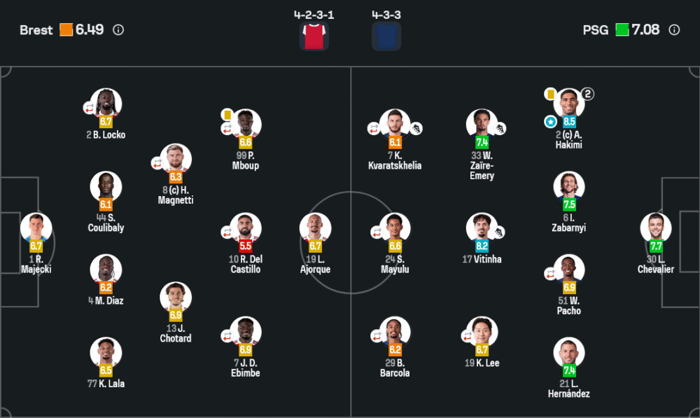 อัชราฟ ฮาคิมี่ (Paris Saint-Germain) — ฟูลแบ็กตัวรุกสุดโหดที่สร้างความแตกต่าง ยิง 2 ประตูตั้งแต่ครึ่งแรกและช่วยเกมรับอย่างสมบูรณ์แบบ คว้าคะแนนสูงสุดของเกมที่ 8.5