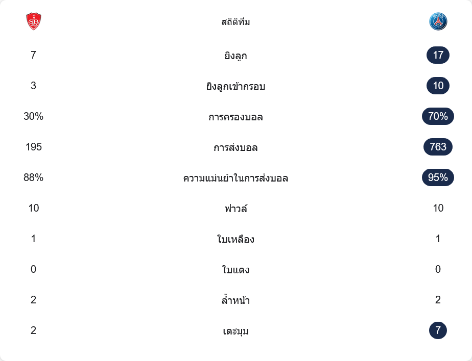เกมนี้ เปแอสเช ครองบอลสูงถึง 70% เทียบกับ 30% ของแบรสต์ และมีโอกาสยิงถึง 17 ครั้ง เข้ากรอบ 10 ครั้ง ส่วนแบรสต์มีโอกาสยิงเพียง 7 ครั้ง เข้ากรอบ 3 ครั้ง ความแตกต่างชัดเจนในเกมนี้คือความเฉียบคมในการจบสกอร์และการควบคุมพื้นที่แดนกลาง เปแอสเชผ่านบอล 763 ครั้ง ด้วยความแม่นยำ 95% ในขณะที่เจ้าบ้านผ่านบอลเพียง 195 ครั้ง ความเหนือชั้นของทีมเยือนสะท้อนออกมาเต็มๆ จากสถิติ