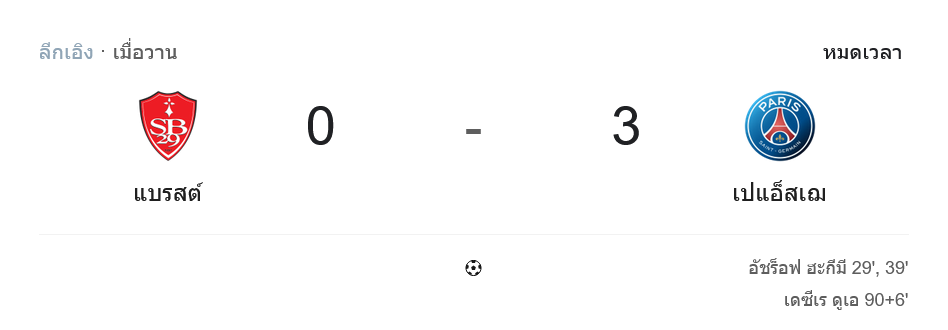 ค่ำคืนแห่งความดุดันของ ลีกเอิง ฝรั่งเศส ต้องยกให้เกมนี้ เมื่อ ปารีส แซงต์ แชร์กแมง บุกไปถล่ม แบรสต์ ถึงถิ่น 0-3 แบบเหนือชั้น จากผลงานร้อนแรงของ อัชราฟ ฮาคิมี่ ที่ยิงสองประตูตั้งแต่ครึ่งแรก พร้อมปิดจ็อบด้วยลูกปิดท้ายของ เดซิเร ดูเอ นาทีท้าย ชัยชนะนี้ส่งให้ทัพเปแอสเชแซงขึ้นไปยึดตำแหน่งจ่าฝูงทันที ขณะที่แฟนบอล บ้านผลบอล นั่งยิ้มรับชัยเกมนี้อย่างเต็มปากเต็มคำ