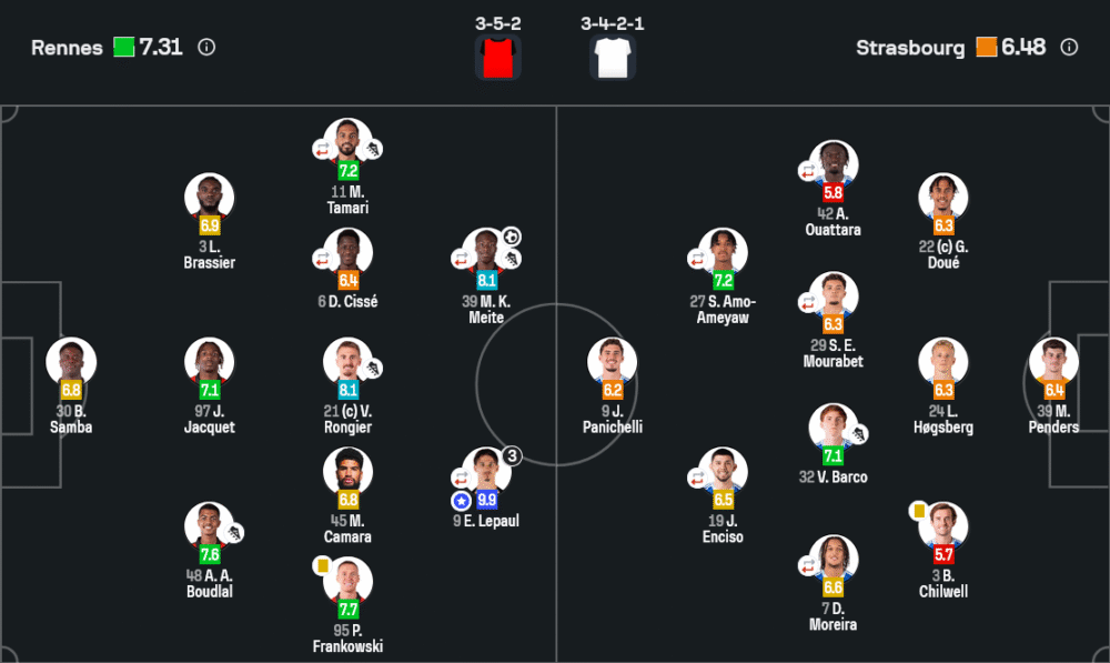 วิเคราะห์บอล เกมนี้ชัดเจนว่าแรนส์เหนือกว่าทุกด้านในแท็กติกของ ฮาบิบ เบเย่ ที่สั่งลูกทีมเพรสซิ่งสูงตลอดเวลาและใช้บอลเร็วโจมตีจากริมเส้นผ่านคู่ฟูลแบ็กฟรังโกฟสกี้และทามารี ทำให้เกมรุกดูไหลลื่นและสร้างโอกาสได้ต่อเนื่อง ส่วนแนวรับของทีมก็เก็บบอลสองได้หมดโดยมีรงเชียร์เป็นหัวใจสำคัญ การป้องกันเป็นระบบแน่นอน ขณะที่ทางฝั่งสตารส์บูร์กของ เลียม โรเซเนียร์ พยายามตั้งเกมจากแดนหลังแต่เจอแรงเพรสจนเสียบอลบ่อย การครองบอลแม้จะมากกว่าแต่จังหวะจบสกอร์ขาดความเฉียบคม นับเป็นอีกหนึ่งเกมที่แรนส์ “เข้มทั้งรุกและรับ” สมกับฟอร์มทีมใหญ่ใน ลีกเอิง