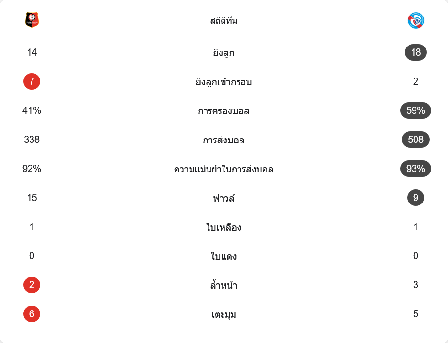 แม้ตัวเลขจะชี้ว่าสตารส์บูร์กครองบอลถึง 59% และผ่านบอลกว่า 508 ครั้ง แต่ความเฉียบขาดเป็นของเจ้าบ้านที่ยิงเข้ากรอบถึง 7 ครั้งจากทั้งหมด 14 ลูก เทียบกับทีมเยือนที่ยิงตรงกรอบเพียง 2 หนเท่านั้น ความแม่นยำของการจ่ายบอลของทั้งสองทีมถือว่าสูง แรนส์อยู่ที่ 92% ส่วนสตารส์บูร์ก 93% เกมนี้ฟาวล์รวม 24 ครั้ง ใบเหลืองฝั่งละหนึ่ง แต่แรนส์ได้เตะมุมมากกว่า 6 ต่อ 5 บ่งบอกถึงการบุกต่อเนื่องอย่างไม่หยุดพัก