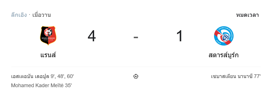 ศึก ลีกเอิง ฝรั่งเศส คืนนี้แฟนบอลที่ตามดู ผลบอลสด คงได้มันกันสุดๆ เมื่อ แรนส์ เปิดบ้านถล่ม สตารส์บูร์ก ไปอย่างขาดลอย 4-1 โดยมีชื่อของ เอสเตบัน เลอเปาล์ โชว์ฟอร์มสุดฮอตเหมาคนเดียว 3 ประตู บวกกับอีกลูกจาก โมฮาเหม็ด คาดี เมอิเต้ ส่งให้เจ้าบ้านเก็บชัยชนะสุดหรู พร้อมขยับอันดับใน ตารางคะแนนลีกเอิง แบบมีลุ้นกลับเข้าสู่ครึ่งบนของตารางอีกครั้ง