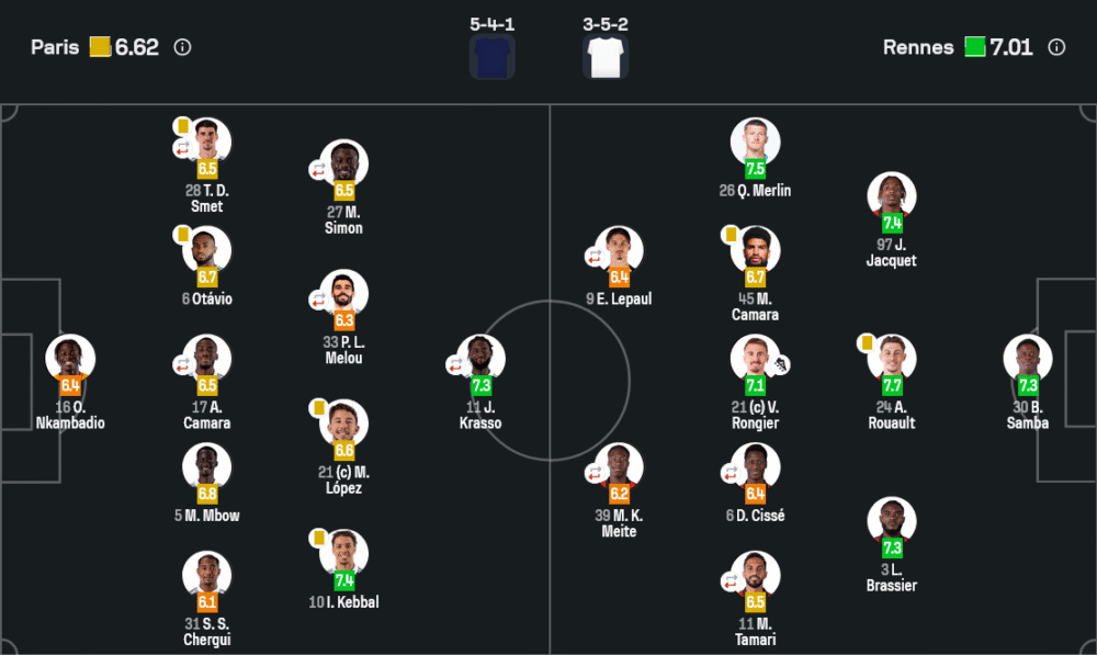 เกมนี้ตำแหน่ง Player of the match ไปไหนไม่ได้นอกจาก เบรีล เอ็มโบโล่ หอกทีมชาติสวิตเซอร์แลนด์ของแรนส์ ลงสนามแค่ราวครึ่งชั่วโมงแต่เปลี่ยนรูปเกมแบบหน้ามือเป็นหลังมือ ด้วยเรตติ้ง 7.8 เขาใช้ความแข็งแกร่งบังบอลพักบอลให้เพื่อนเล่นง่ายขึ้น ทำให้แผงหลังปารีส เอฟซี ไม่กล้าดันสูงเหมือนช่วงต้นเกม ที่สำคัญคือจังหวะหลุดเดี่ยวนาที 81 ที่ควบแซงกองหลังเข้าไปซัดประตูชัยอย่างเยือกเย็น นอกจากสกอร์แล้ว เอ็มโบโล่ ยังช่วยไล่เพรสและถ่างแนวรับคู่แข่งจนเพื่อนร่วมทีมมีพื้นที่เล่นมากขึ้น เรียกได้ว่าเป็นซูเปอร์ซับของแท้ในค่ำคืนนี้