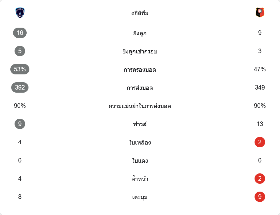 ตัวเลขหลังเกมยืนยันว่า ปารีส เอฟซี ไม่ได้เล่นแย่เลย พวกเขายิงทั้งหมด 16 ครั้ง เข้ากรอบ 5 ครั้ง มากกว่าแรนส์ที่ยิงเพียง 9 ครั้ง เข้ากรอบ 3 ครั้ง แต่ประตูเดียวของ เอ็มโบโล่ คือจังหวะคมกริบที่เปลี่ยนทุกอย่าง