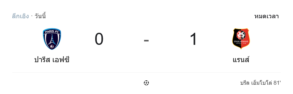 ท้ายเกมเจ้าบ้านเปิดหน้าแลกเต็มกำลัง ส่ง นูฮา ดิคโก้, วินเซนต์ มาร์เก็ตติ และ ตูโอมาส อัลลิลา ลงเสริม แต่แนวรับแรนส์ที่มี อองโตนี่ รูโอโอลต์ และ โลอิก บราสซิเยร์ ยืนคุมพื้นที่แน่นมาก เคลียร์ทุกจังหวะอันตราย แถมช่วงทดเจ็บ ปารีส เอฟซี ยังหัวร้อนจน โอตาวิโอ กับ เค็บบาล โดนใบเหลืองเพิ่มคนละใบ สุดท้ายไล่ตีเสมอไม่ได้ จบเกมตาม บ้านผลบอล ยืนยันสกอร์ชัดเจน ปารีส เอฟซี แพ้คาบ้าน 0-1 ให้แรนส์ไปอย่างเจ็บปวด