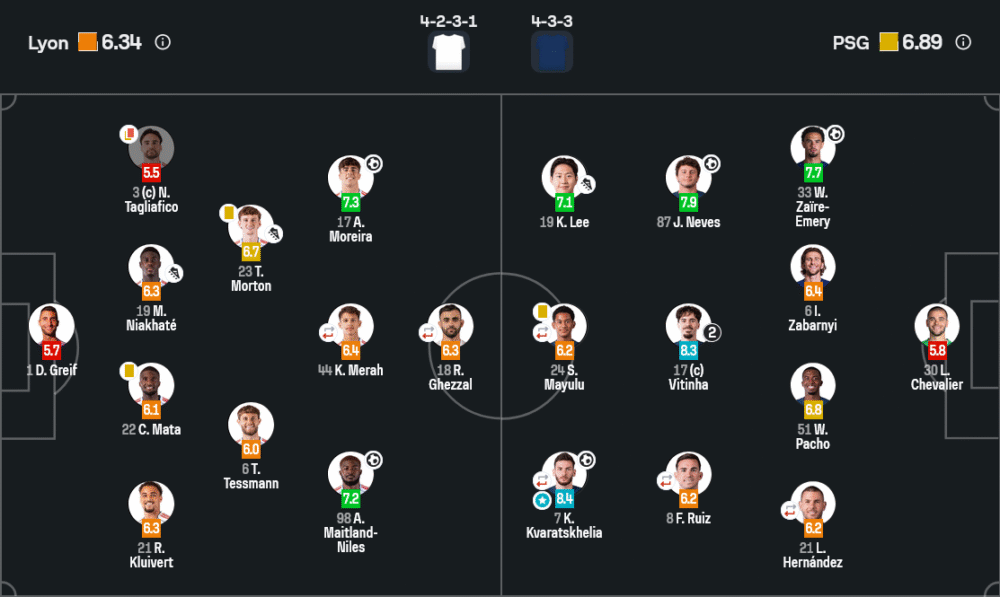 รางวัลแมนออฟเดอะแมตช์ตกเป็นของ ควิชา ควารัตสเคเลีย ปีกซ้ายตัวจี๊ดของเปแอสเช เจ้าของเรตติ้ง 8.4 จาก Sofascore เกมนี้เขาเป็นฝันร้ายของแนวรับลียงโดยตรง เลี้ยงกินตัว ตัดเข้าในสร้างโอกาสยิงหลายครั้ง ประตู 1-2 ที่เจ้าตัวปั่นเสียบเสาเป็นช็อตระดับไฮไลต์ เปลี่ยนโมเมนตัมเกมกลับไปอยู่ฝั่งทีมเยือน นอกจากนี้ยังช่วยถ่างแนวรับคู่แข่ง เปิดพื้นที่ให้ วิตินญ่า และ เนเวส ทำเกมตรงกลางได้สะดวกขึ้น แม้จะถูกเปลี่ยนตัวออกช่วงท้าย แต่ผลกระทบจากผลงานของเขายังส่งต่อจนทีมได้จุดโทษชัยในที่สุด