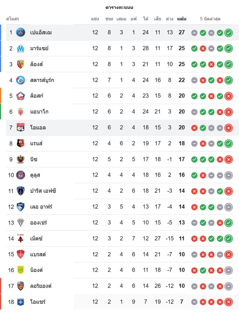 ส่วน โอลิมปิก ลียง มี 20 แต้ม จากผลงาน ชนะ 6 เสมอ 2 แพ้ 4 ประตูได้ 18 เสีย 15 รั้งอันดับ 7 ของตาราง ยังอยู่ในกลุ่มลุ้นพื้นที่ยุโรป แต่ความพ่ายแพ้คาบ้านรวมถึงปัญหาใบแดงของ ตายาฟิโก้ ทำให้ทีมต้องรีบเคลียร์จังหวะเกมรับ และจัดการเรื่องวินัยให้เร็ว ก่อนที่ช่องว่างกับท็อปโฟร์จะถ่างกว้างไปกว่านี้