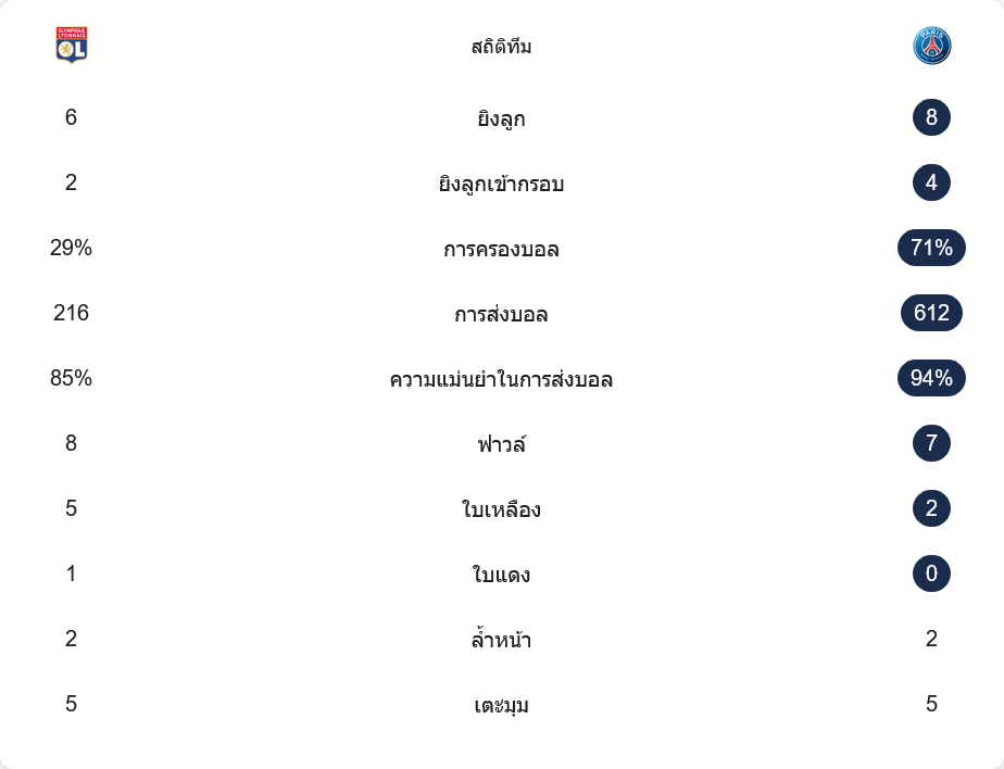 ตัวเลขหลังเกมสะท้อนรูปเกมชัดเจน ลียงมีโอกาสยิงเพียง 6 ครั้ง เข้ากรอบ 2 ครั้ง แต่เปลี่ยนเป็น 2 ประตู แสดงให้เห็นถึงความคมเมื่อได้จังหวะ ในขณะที่ เปแอสเช ยิง 8 ครั้ง เข้ากรอบ 4 ครั้ง และควบคุมจังหวะด้วยการครองบอลมากถึง 71% เทียบกับลียงแค่ 29% การส่งบอลของทีมเยือนสูงถึง 612 ครั้ง พร้อมความแม่นยำระดับ 94% ขณะที่ลียงจ่ายเพียง 216 ครั้ง ความแม่นยำ 85%