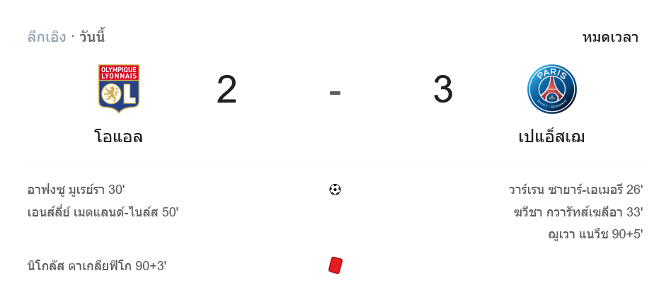 ศึก ลีกเอิง ฝรั่งเศส ที่กรูปามาเหมือนหนังดราม่า โอลิมปิก ลียง เปิดบ้านแพ้ ปารีส แซงต์-แชร์กแมง 2-3 เกมนี้ “บ้านกีฬา” นั่งเช็ก ผลบอลสด กันแบบหัวใจเต้นรัว เพราะสกอร์พลิกไปมาจนมาจบที่จุดโทษช่วงทดเจ็บของ ชูเอา เนเวส ส่งให้เปแอสเชเก็บสามแต้มทอง รั้งจ่าฝูงต่อไป ส่วนลียงต้องกลืนความเจ็บปวดจากใบแดงของ นิโกลัส ตายาฟิโก้ ท้ายเกม