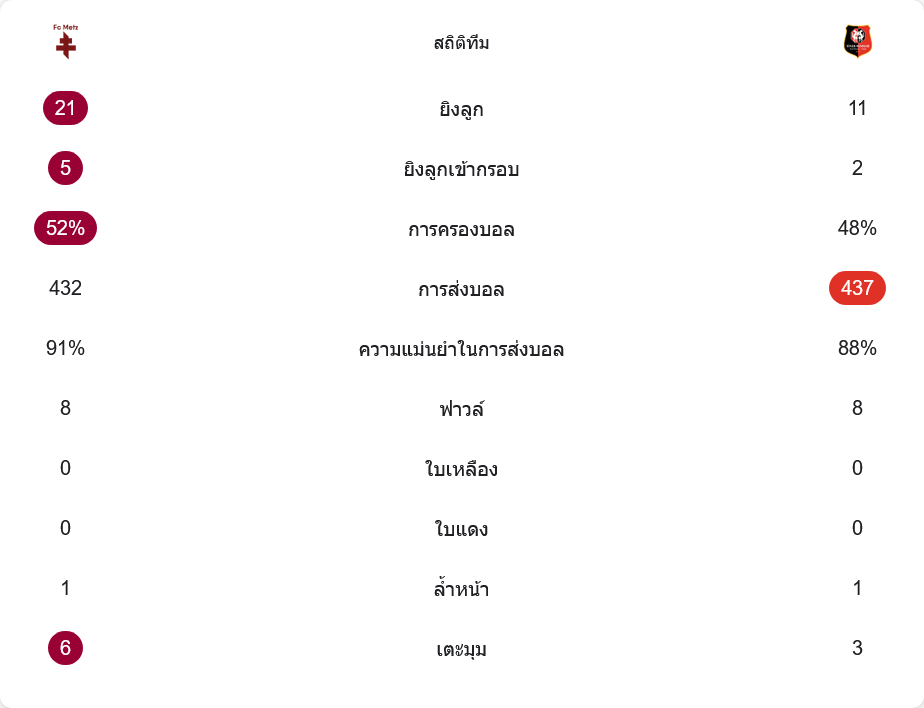 เมื่อมองจากตัวเลขหลังเกม เม็ตซ์เป็นฝ่ายครองบอลเหนือกว่านิดๆ 52% ต่อ 48% และสร้างโอกาสยิงได้มากถึง 21 ครั้ง ขณะที่แรนส์ยิงเพียง 11 หน ทว่าทีมเยือนมีลูกยิงเข้ากรอบแค่ 2 ครั้งก็เพียงพอจะคว้าประตูชัย ส่วนเจ้าบ้านยิงเข้ากรอบ 5 ครั้งแต่ไม่ผ่านมือ บรีส ซ็องบ้า เลย การผ่านบอลถือว่าสูสี เม็ตซ์จ่ายทั้งหมด 432 ครั้ง ความแม่นยำ 91% ส่วนแรนส์จ่าย 437 ครั้ง ความแม่นยำ 88% เท่ากับว่าทั้งสองทีมเล่นบอลบนพื้นได้ดีทั้งคู่ เกมค่อนข้างแฟร์ ไม่มีจังหวะบู๊เดือดเกินเหตุ เพราะไม่มีทั้งใบเหลืองและใบแดง ฟาวล์เท่ากันฝั่งละ 8 ครั้ง ล้ำหน้าอย่างละ 1 ครั้ง แต่ลูกเตะมุม เม็ตซ์ได้มากกว่า 6 ต่อ 3 สะท้อนว่าเจ้าบ้านบุกกดดันจนแรนส์ต้องเคลียร์บอลออกหลังหลายครั้ง