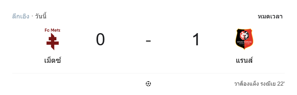 ศึกลีกเอิง ฝรั่งเศส คู่ดึกที่สังเวียนเหย้าเม็ตซ์ จบลงด้วยชัยชนะของทีมเยือนแรนส์ 1-0 จากประตูโทนช่วงต้นเกม นาที 22 ของ บรีล เอ็มโบโล่ ที่ซัดไม่เหลือ จากจังหวะต่อบอลเร็วกับ วาเลนติน รงชิเยร์ แม้รูปเกมโดยรวมเจ้าถิ่นจะลุยใส่แบบไม่กลัวตาย ยิงมากกว่าถึง 21 ครั้ง แต่สุดท้ายก็ทะลวงแนวรับทีมเยือนไม่ได้ ตามรายงาน ผลบอลสด และภาพรวมจากสถิติหลังเกมที่ บ้านกีฬา เก็บมาถอดให้ฟังแบบละเอียดยิบ