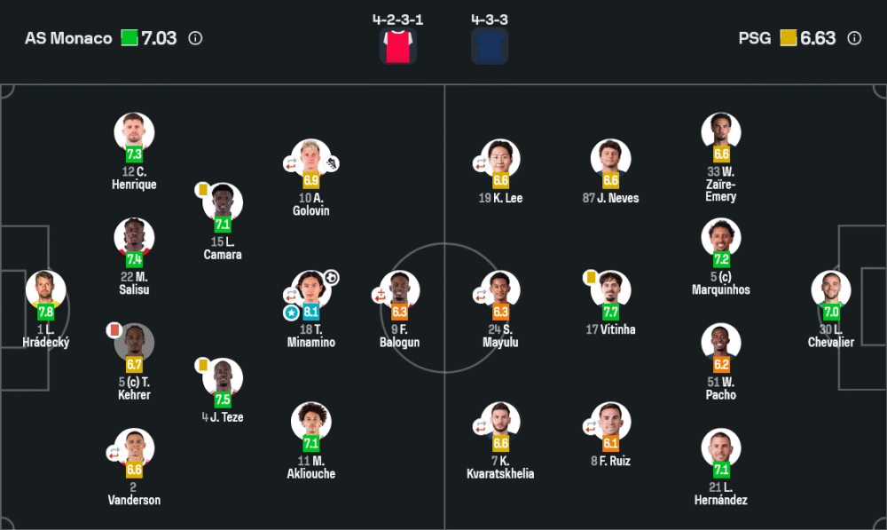 - ⚽ 68′ ประตู 1-0 โมนาโก – อเล็กซานเดอร์ โกโลวิน จ่ายหักเข้าในให้ ทาคุมิ มินามิโนะ ซัดเต็มข้อเสียบเสา กลายเป็นประตูชัยของเกม