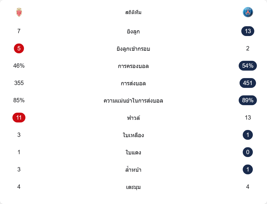 ตัวเลขหลังเกมสะท้อนภาพรวมได้ชัดเจน เปแอสเชครองบอล 54% ต่อ 46% ส่งบอล 451 ครั้งมากกว่าโมนาโกที่ 355 ครั้ง แถมความแม่นยำการจ่ายยังสูงถึง 89% ขณะที่เจ้าถิ่นอยู่ที่ 85% อย่างไรก็ตามเมื่อมองที่คุณภาพโอกาสยิง โมนาโกทำได้ดีกว่าอย่างชัดเจน พวกเขายิงทั้งหมด 7 ครั้ง เข้ากรอบถึง 5 ครั้ง ขณะที่เปแอสเชแม้จะส่องไปถึง 13 ครั้ง แต่เข้ากรอบเพียง 2 เท่านั้น