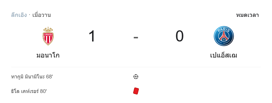 อย่างไรก็ตาม แนวรับโมนาโกที่มี ฮราเด็คกี้ ยืนดักลูกกลางอากาศนิ่งสุดๆ ช่วยกันบล็อกได้ทุกดอก เปแอสเชยิงได้เพียง 2 ครั้งเข้ากรอบตลอดเกม สุดท้ายเสียงนกหวีดยาวดังขึ้น เจ้าถิ่นเฉือนชนะ 1-0 คว้าชัยสุดหืดแต่โคตรคุ้มค่า