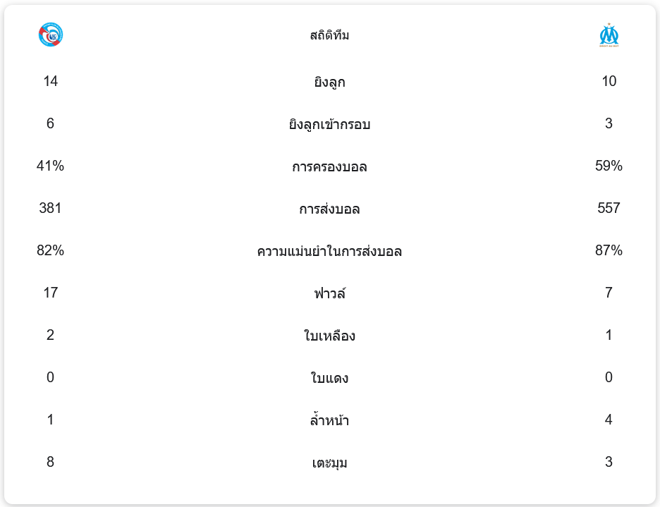 ในเกมนี้ สตารส์บูร์กมีโอกาสยิงทั้งหมด 14 ครั้ง โดยเข้ากรอบ 6 ครั้ง ขณะที่โอลิมปิก มาร์กเซยมีโอกาสยิง 10 ครั้ง เข้ากรอบ 3 ครั้ง การครองบอลมาร์กเซยทำได้ดีกว่าด้วยอัตราการครองบอล 59% ต่อ 41% และมีการส่งบอลทั้งหมด 557 ครั้ง เทียบกับสตารส์บูร์กที่ทำได้ 381 ครั้ง แต่สุดท้ายความแม่นยำในการจบสกอร์ของสตารส์บูร์กเป็นตัวชี้ขาดในการคว้าชัยชนะ