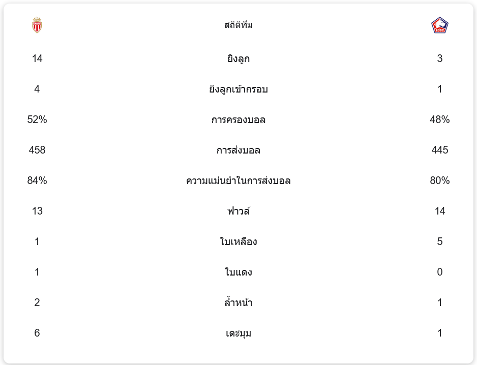 ในเกมนี้ โมนาโกสามารถครองบอลได้มากถึง 52% ขณะที่ลีลล์ครองบอล 48% แต่สิ่งที่น่าสนใจคือจำนวนการยิงของทั้งสองทีม โมนาโกยิงไปทั้งหมด 14 ครั้ง และเข้ากรอบ 4 ครั้ง ขณะที่ลีลล์ยิงเพียง 3 ครั้ง และเข้ากรอบเพียงครั้งเดียว ความแม่นยำในการส่งบอลของทั้งสองทีมก็สูงมาก โดยโมนาโกอยู่ที่ 84% และลีลล์อยู่ที่ 80% แสดงให้เห็นถึงการคุมจังหวะบอลที่ดีของทั้งสองทีม