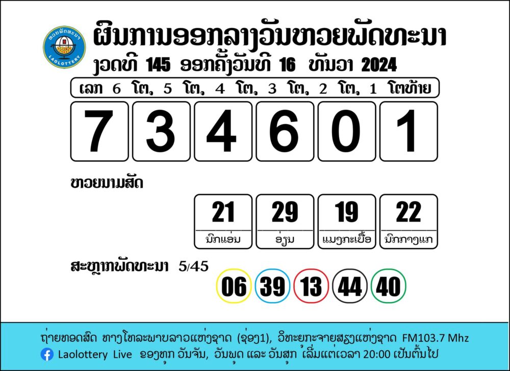 ตรวจหวยลาววันนี้ งวดประจำวันจันทร์ที่ 16 ธันวาคม 2567